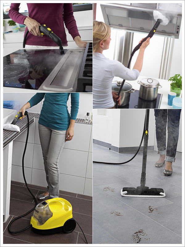 まず、スチームクリーナーを行う際の最初のポイントですが、水切りを行います。特にケルヒャー製のスチームクリーナー(キャニスター型)では注意すべき点となるのですが、水切りを行わないと、最初にスチームではなくてお湯が出てしまうという事があるからです。そうならないために、スチームが安定するまで何度か水を出すようにするのです。